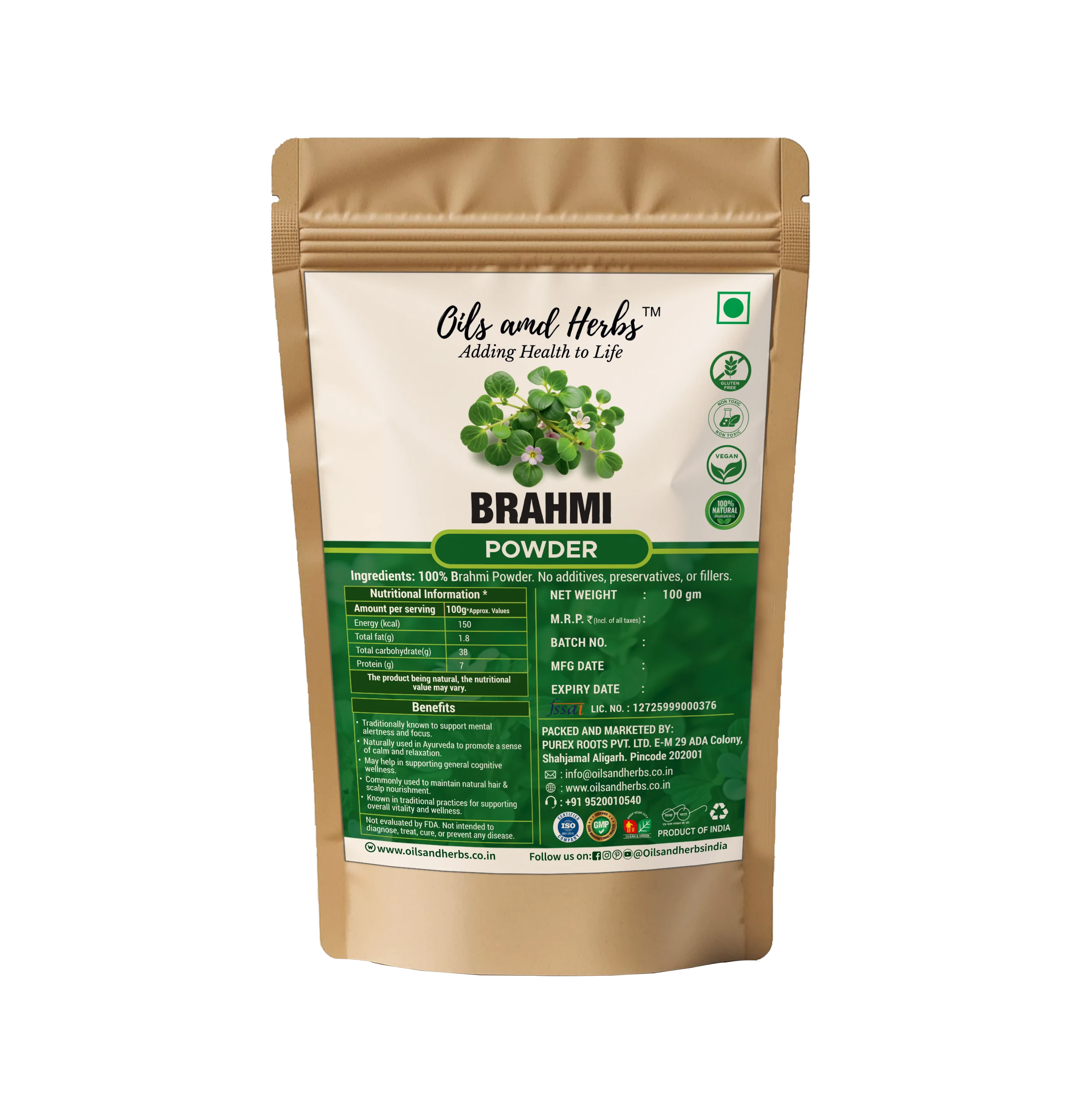 Clean pure Brahmi Powder – Bacopa Monnieri is a revered Ayurvedic brain tonic known to enhance memory, focus, and calm. 100% pure, natural, and ethically sourced from certified producers.