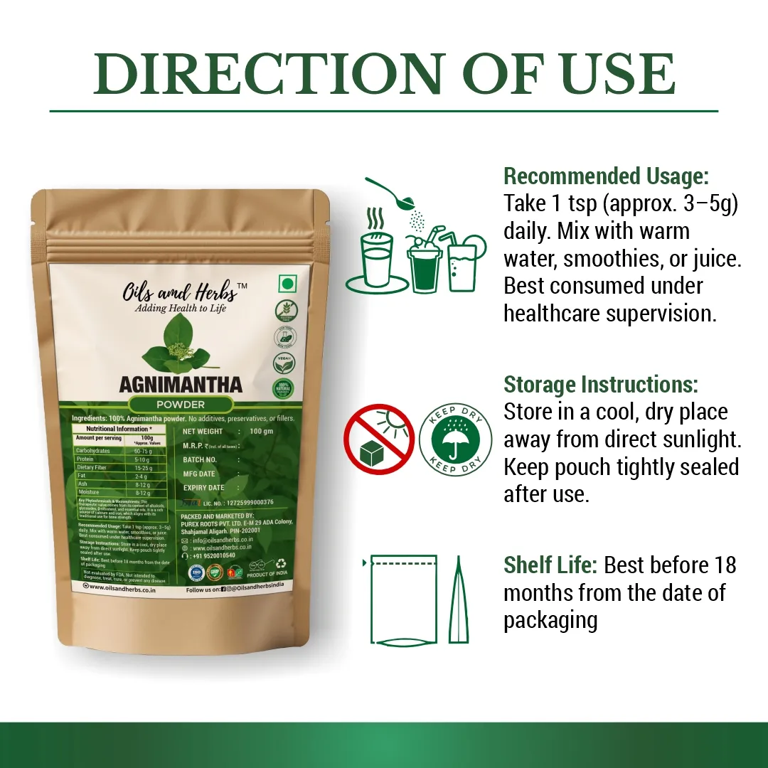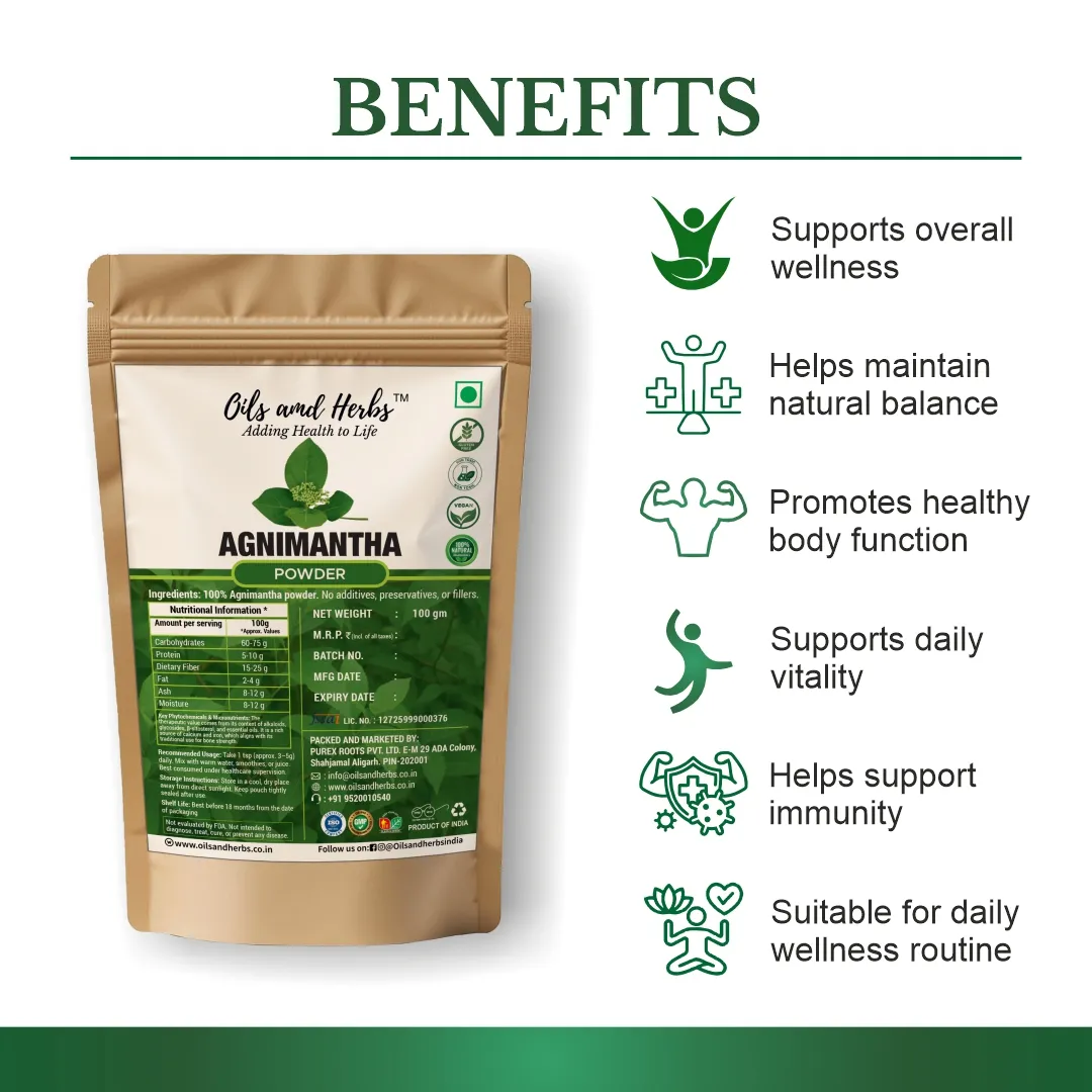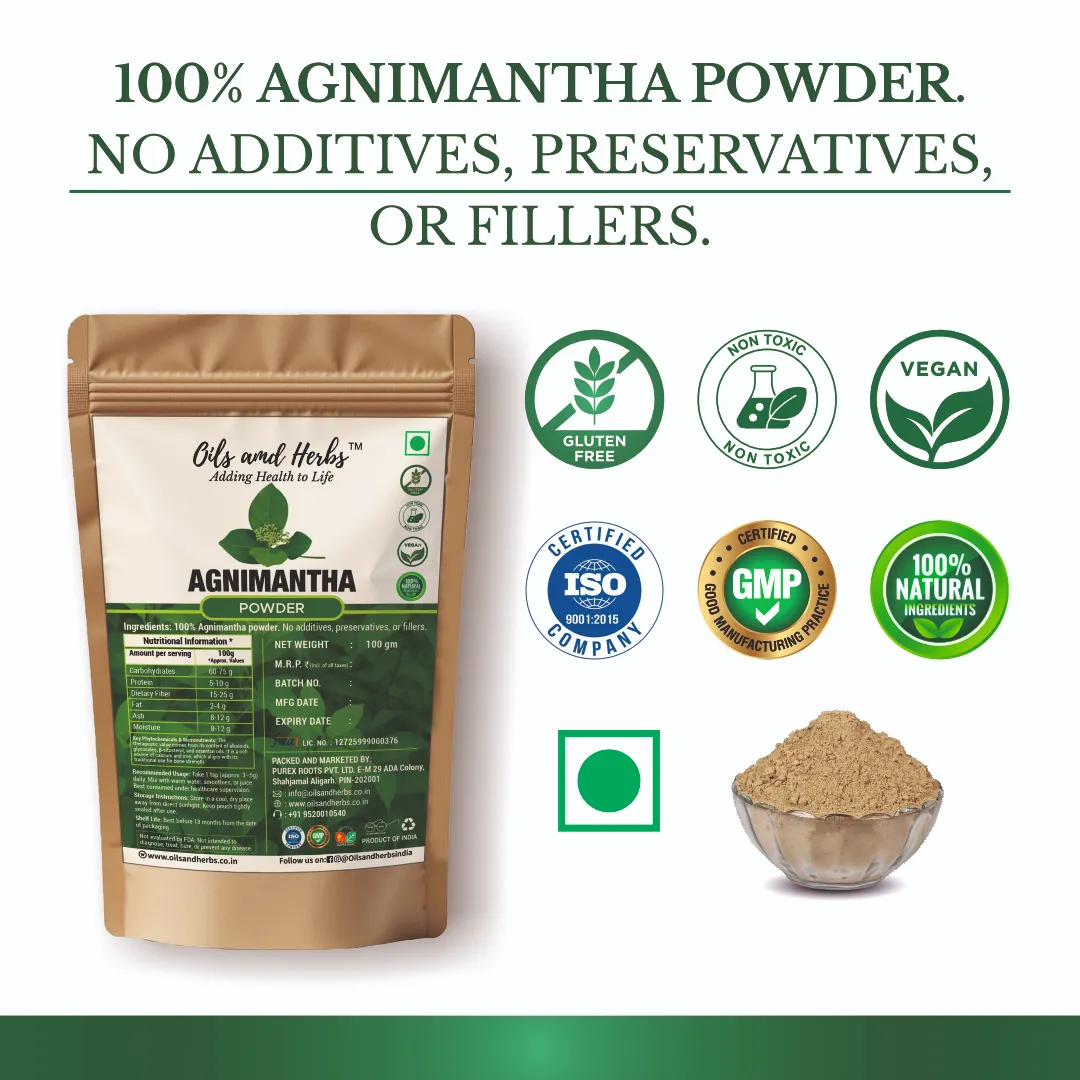 pure Agnimantha Powder – Premna integrifolia is a powerful Ayurvedic herb used to support digestion, kidney health, and Vata balance. Sourced from . farms and sun-dried to preserve potency.
