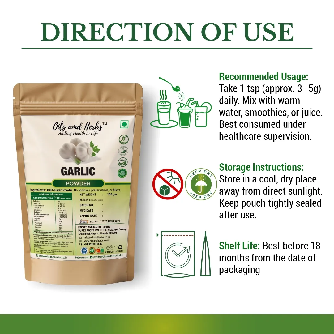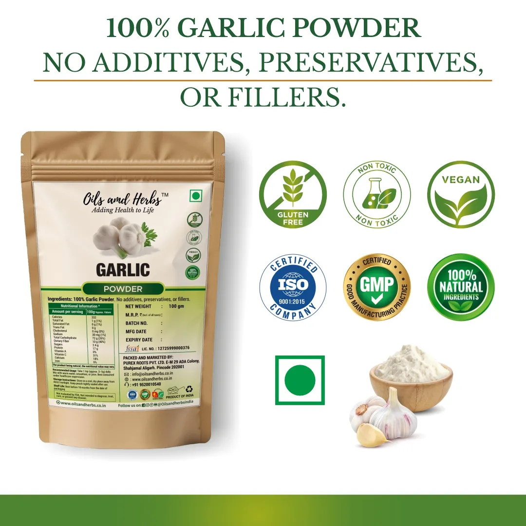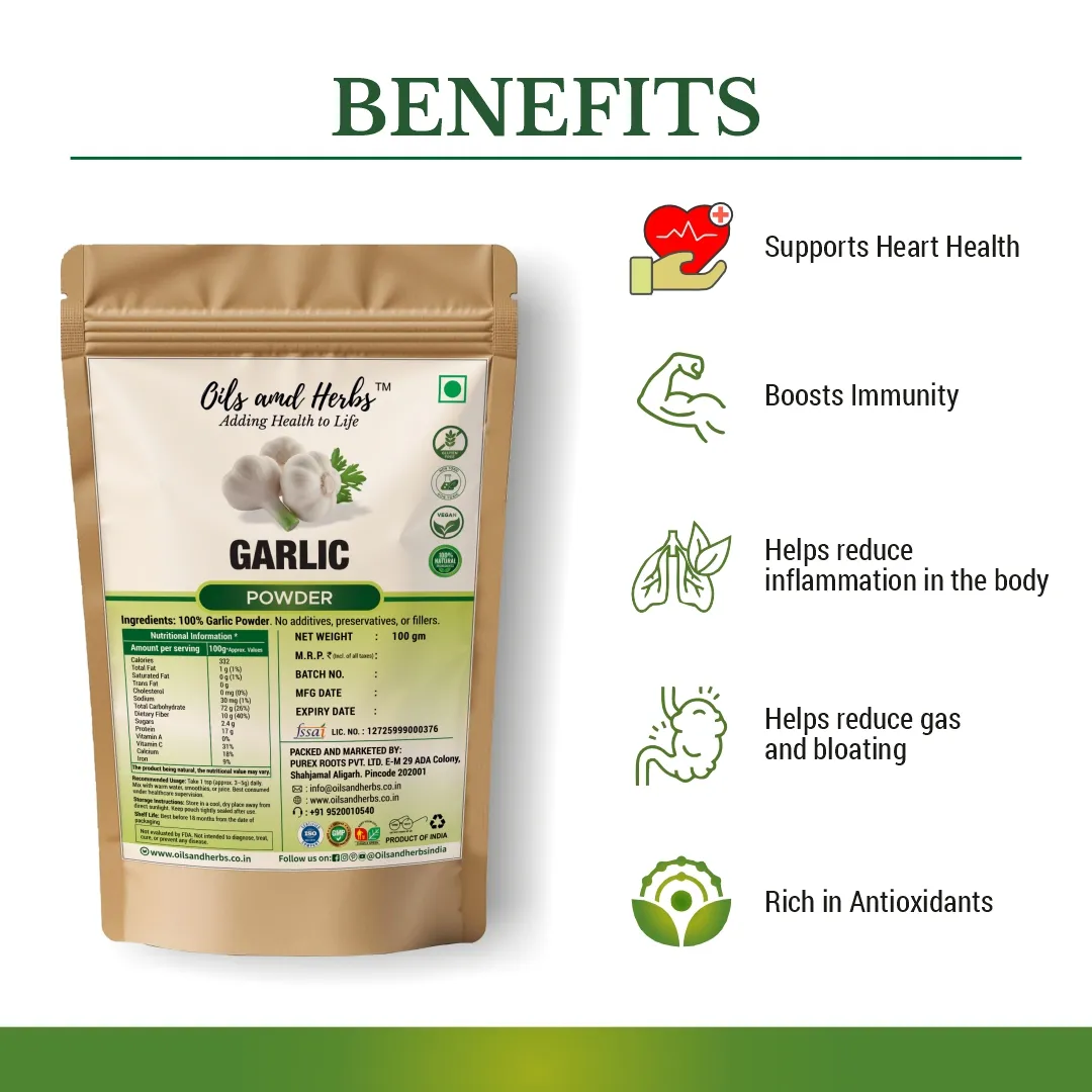 Pure Garlic Powder – Allium Sativum is a 100% pure, potent, and natural herbal powder made from pureally grown garlic bulbs. Known for its heart-healthy, anti-inflammatory, and immune-boosting properties, this traditional remedy supports blood pressure, digestion, and overall wellness. Sourced from . farms in India.